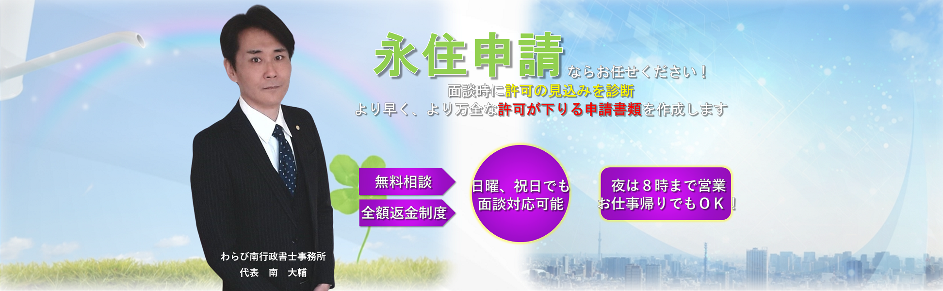 | 事務所名 | わらび南行政書士事務所【さいたま永住サポートオフィス】 |