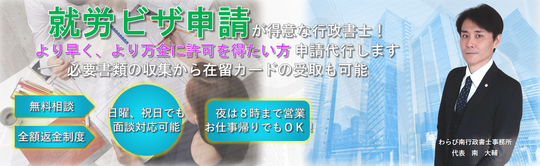 外国人の就労ビザ申請・取得、外国人の雇用、在留資格などのご相談は、わらび南行政書士事務所にご連絡ください。在留資格や就労ビザ、帰化に関する悩みなど、経験豊富な行政書士が、外国人の人材補充・確保・雇用問題をサポートいたします。
