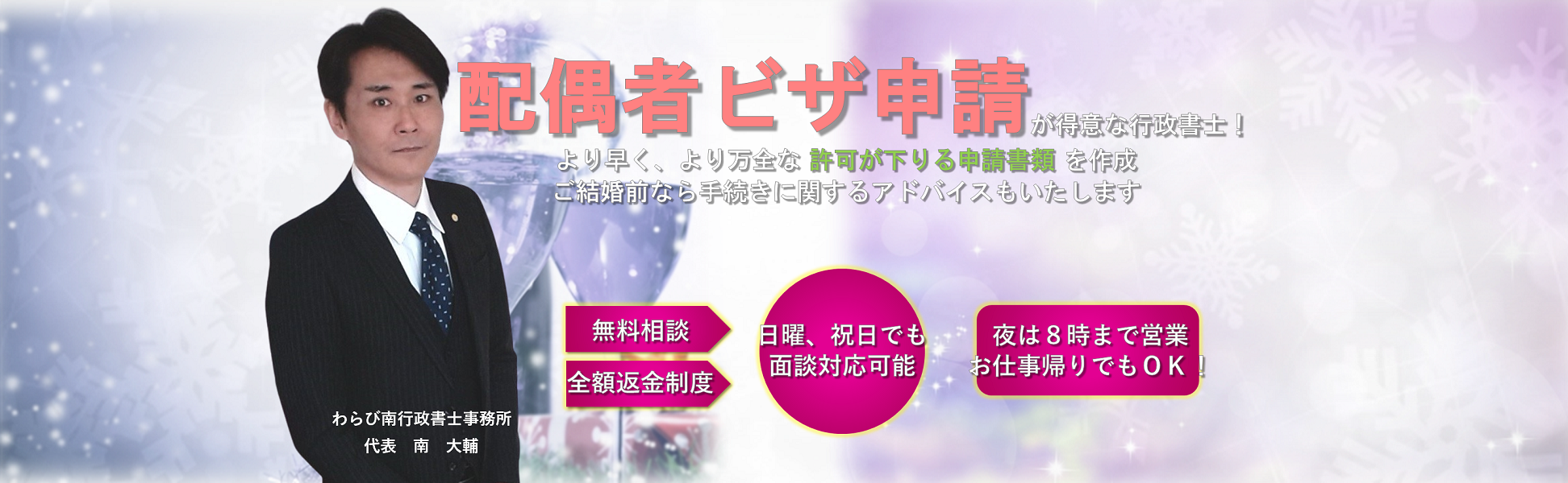 「日本人の配偶者等」や「永住者の配偶者等」といった配偶者ビザ取得のプロフェッショナルが業務に当たりますので、お客さまはどうぞ安心しておまかせください。
