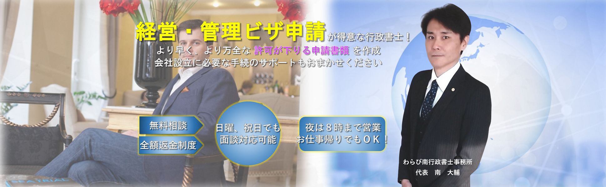 | 事務所名 | わらび南行政書士事務所【さいたま経営・管理ビザサポートオフィス】 |