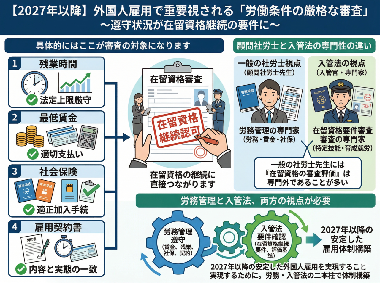 労務管理と入管法、この2つを同時に確認できる体制を整えておくことが、2027年以降の安定した雇用につながります。