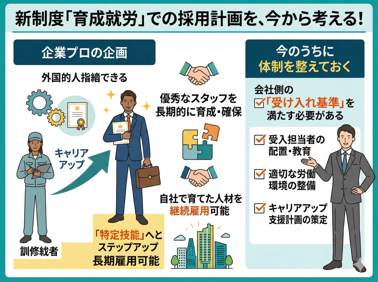 ただし、そのためには会社側が「育成就労の受け入れ基準」を満たしている必要があります。今から体制を整えておくことで、新制度が始まった後も慌てずに済みます。