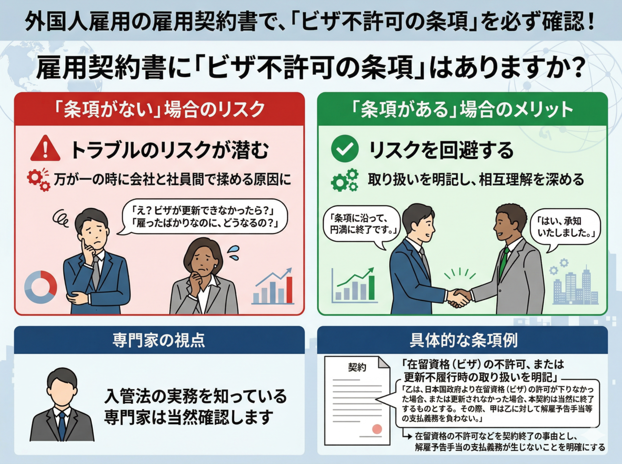 この条項がないと、万が一ビザの更新が通らなかった際に、会社と外国人社員の間でトラブルが発生するリスクがあります。
