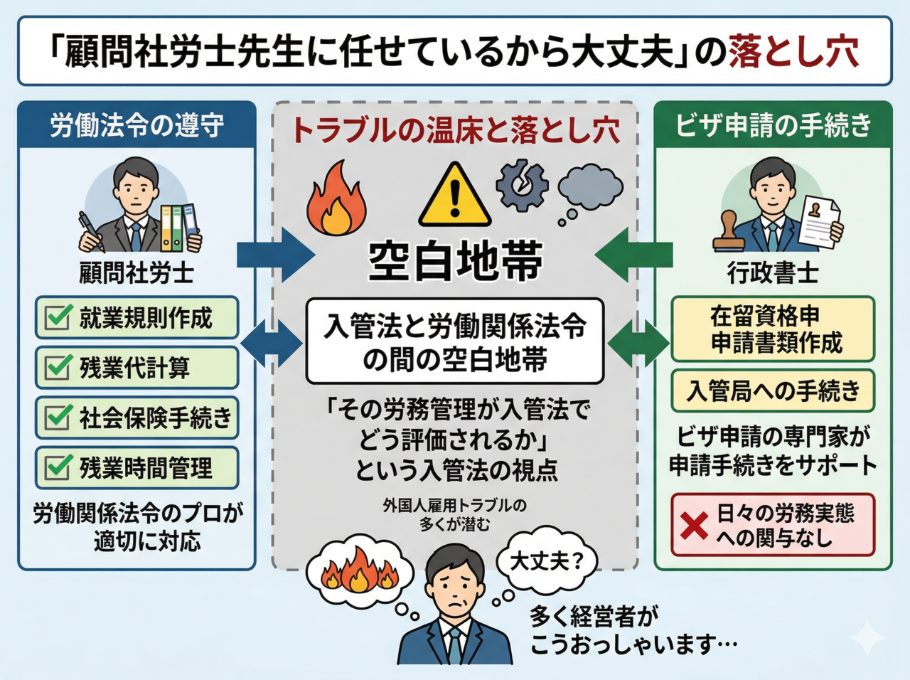この「入管法と労働関係法令の間の空白地帯」に、外国人雇用トラブルの多くが潜んでいます。