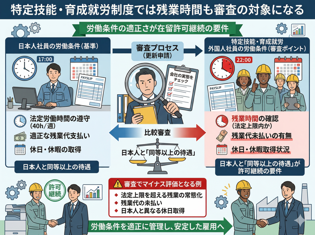 特定技能制度や育成就労制度の在留資格では、労働条件の適正さが許可継続の要件に直結しています。