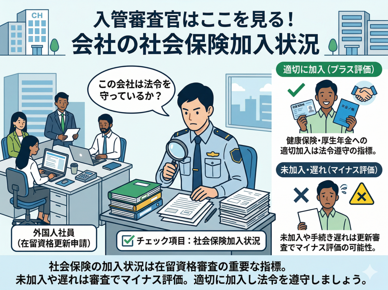 外国人社員が適切に社会保険(健康保険・厚生年金)に加入しているかどうか。これは在留資格の審査において、「この会社がきちんと法令を守っているか」を判断するひとつの指標になっています。